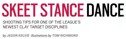 One of the key aspects in skeet shooting, and why it’s often compared to bird hunting, is that targets are presented in a crossing pattern relative to the athlete. High targets thrown over the left shoulder and low targets from the right challenge the athlete to use a full range of motion. Your stance at each station should allow for you to track, lead, and follow- through each target. For stations 2 through 6, a general rule is to align yourself so that your belly button is pointed at the low house (for left-handed shooters, point yourself at the high house). It’s best to break your targets within 5 yards of either side of station 8—that’s the “window” where you’ll have the best range of motion.
